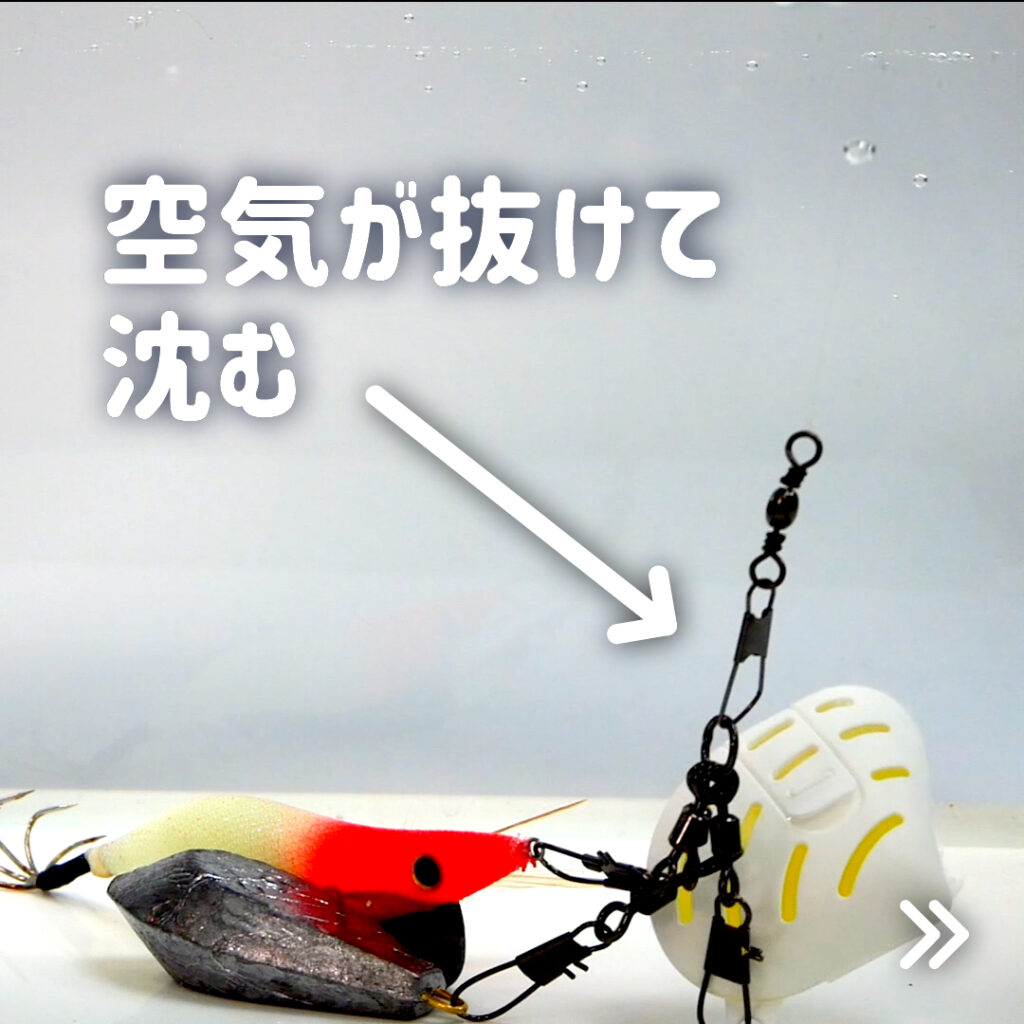 特殊フィルムに穴が空き空気が抜けると浮力が下がります。 徐々に水中で特殊フィルムが分解されていき、穴が空くと空気が抜けて仕掛けが沈みます。